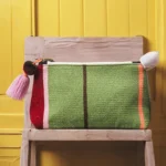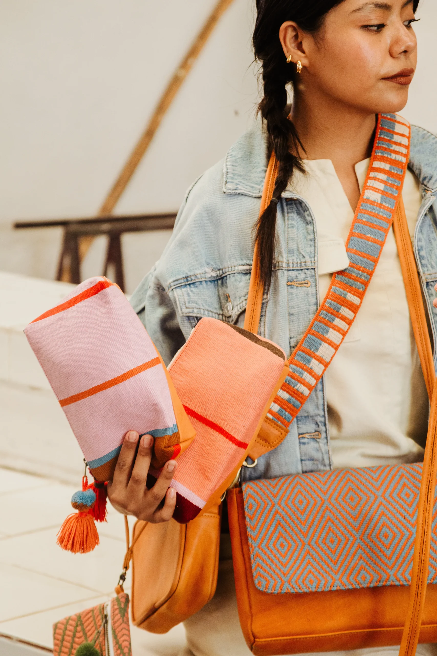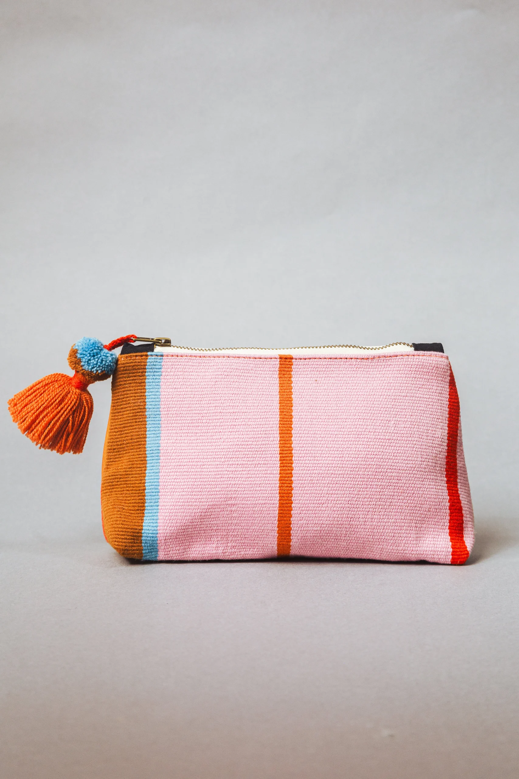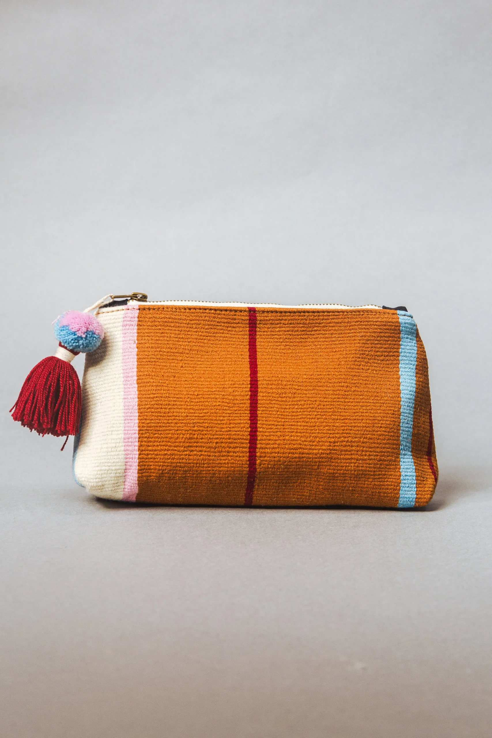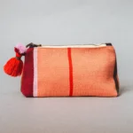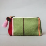 Chaque pochette est tissée à la main, présente des couleurs vives, une tirette zippée à pompon tendance et un dos en cuir chic. Laine de mouton teintée non toxique, cuir péruvien d’origine locale, fermeture éclair en laiton. Tissé à la main avec des techniques textiles andines traditionnelles.